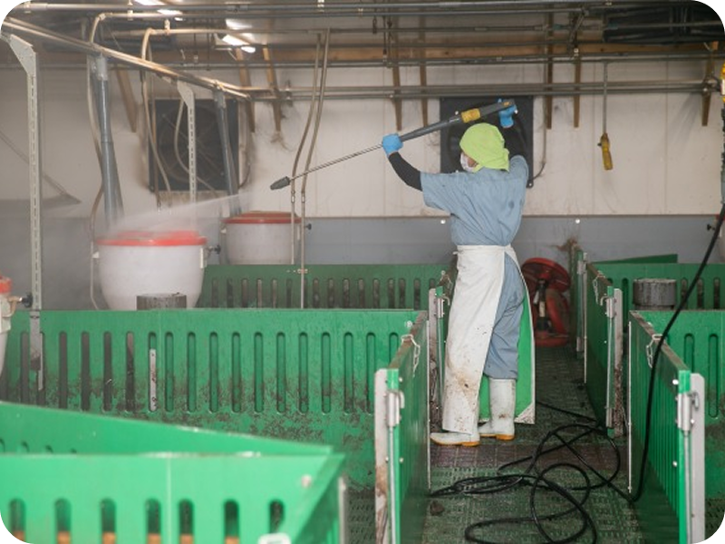 同一日齢の豚を1つのグループとしグループごとに豚舎を分けています。豚が分娩舎から離乳舎等へ、そして肥育舎へと移動するたびに元の豚舎を空にします。そして豚のいない豚舎の洗浄を洗浄し、消毒を行い疫病の蔓延を防ぎます。豚は不衛生による病気に弱いため衛生管理を強化しています。