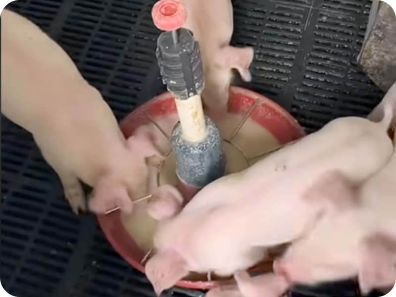 平成12年から導入している給餌管理です。母乳に近い液状ミルクとドライミルクを併用し、徐々にドライミルクに切り替えることで離乳直後の急激な増体落ち込みを緩和する方法です。